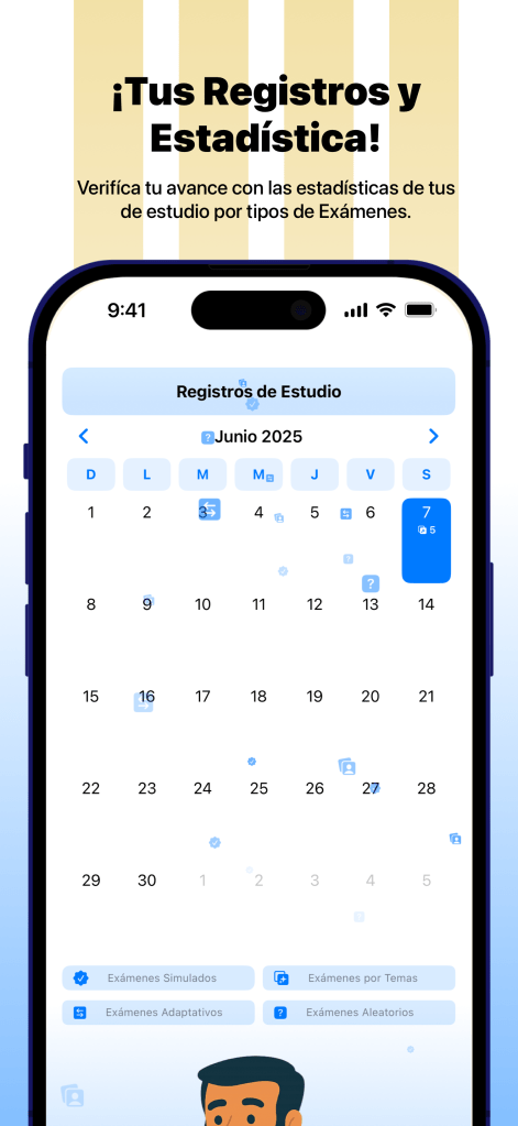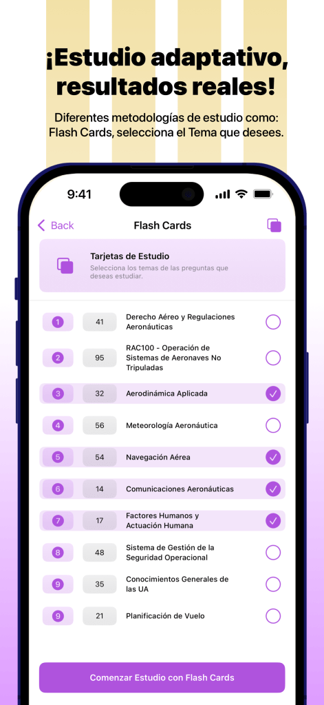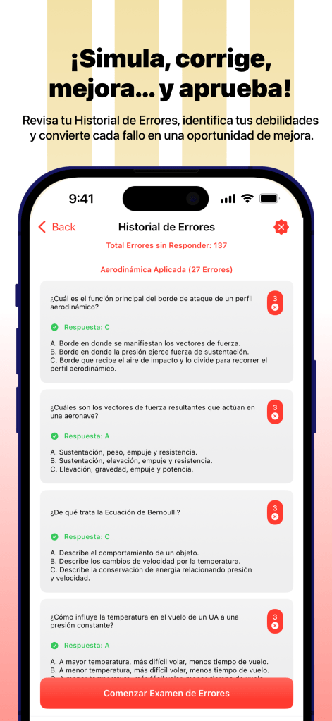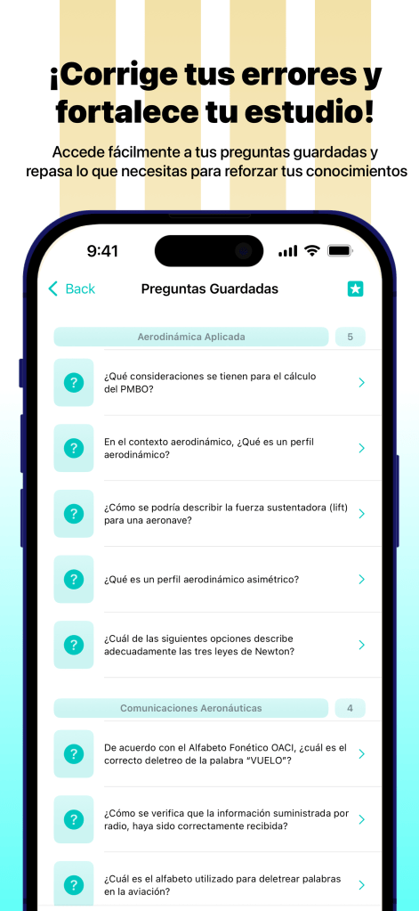 Además, permite estudiar con flash cards, revisar preguntas guardadas, analizar el historial de errores y reforzar conceptos clave.
