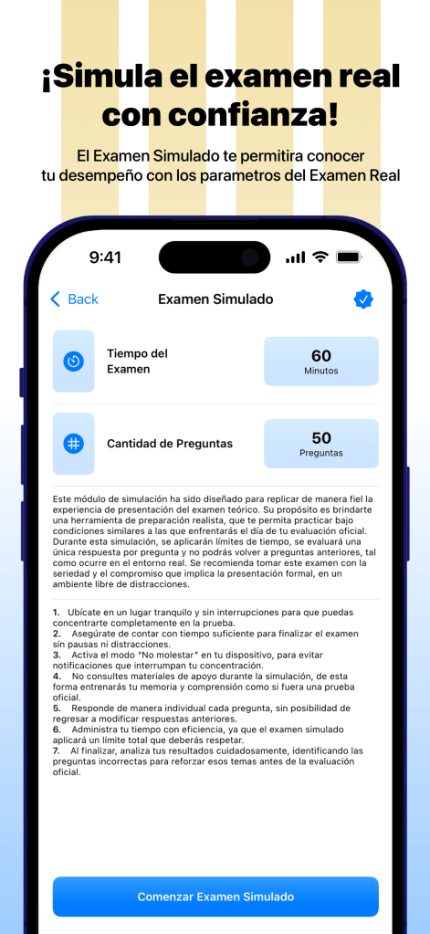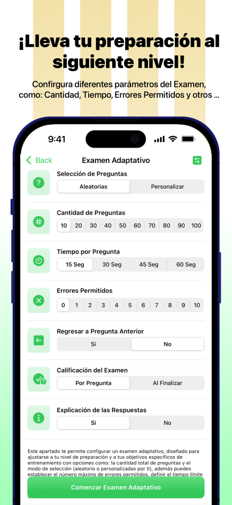 Ofrece múltiples modos de evaluación, incluyendo exámenes por tema, simulaciones realistas y tests adaptativos.
