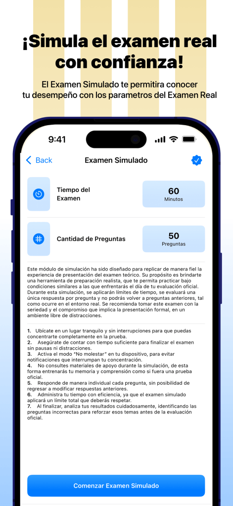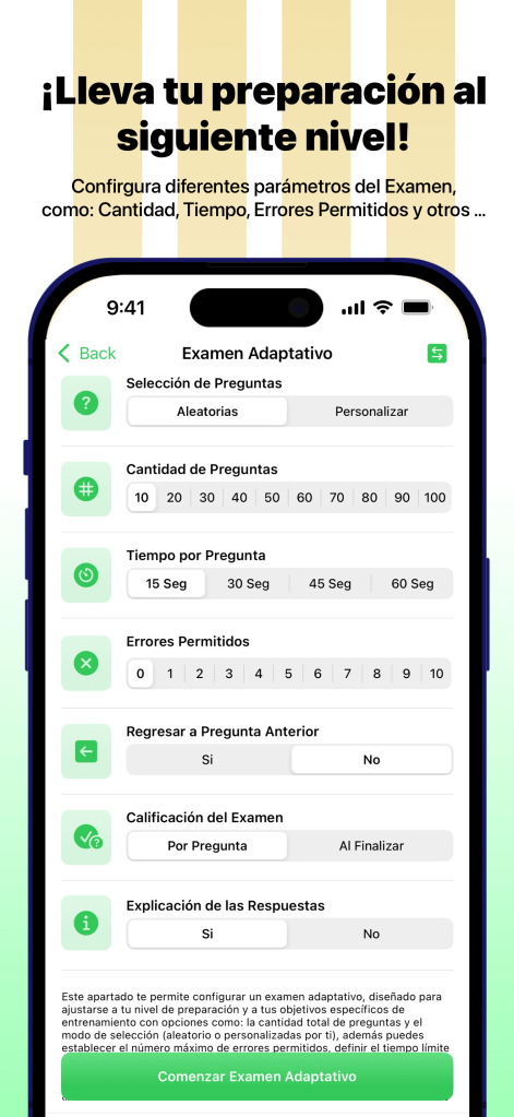 Ofrece múltiples modos de evaluación, incluyendo exámenes por tema, simulaciones realistas y tests adaptativos.