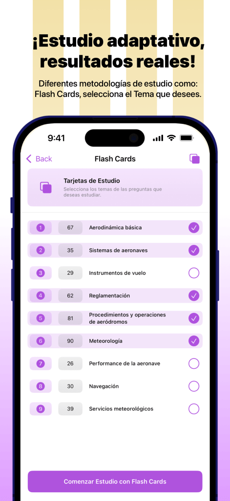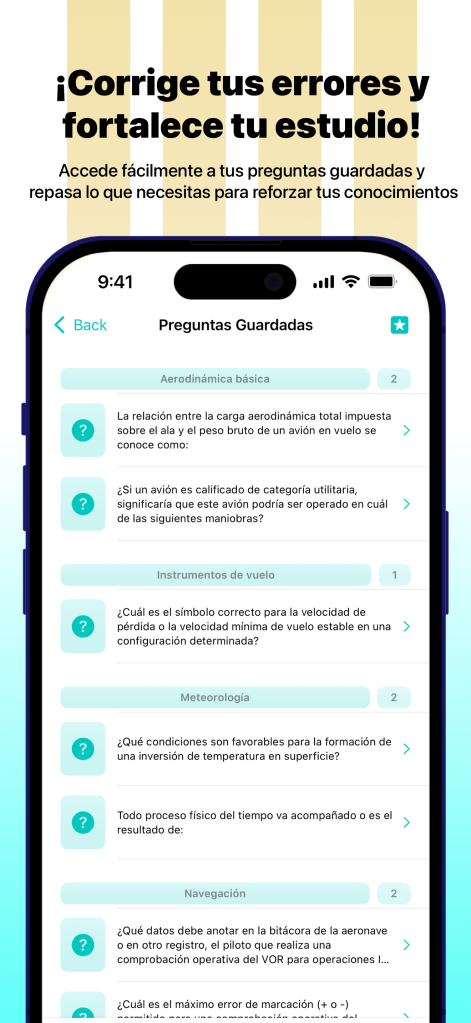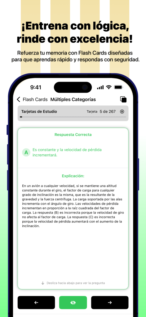 Además, permite estudiar con flash cards, revisar preguntas guardadas, analizar el historial de errores y reforzar conceptos clave.