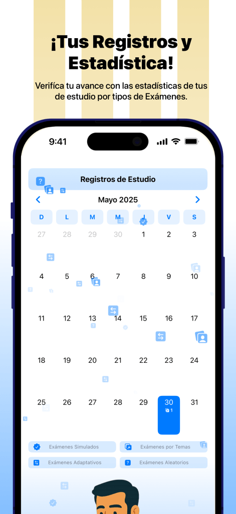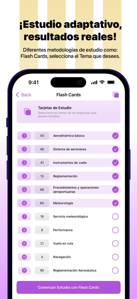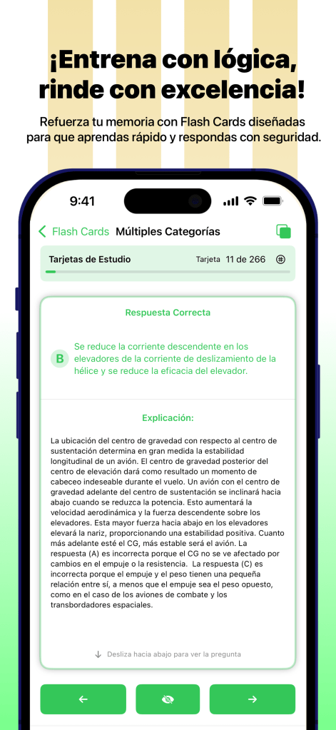Además, permite estudiar con flash cards, revisar preguntas guardadas, analizar el historial de errores y reforzar conceptos clave.