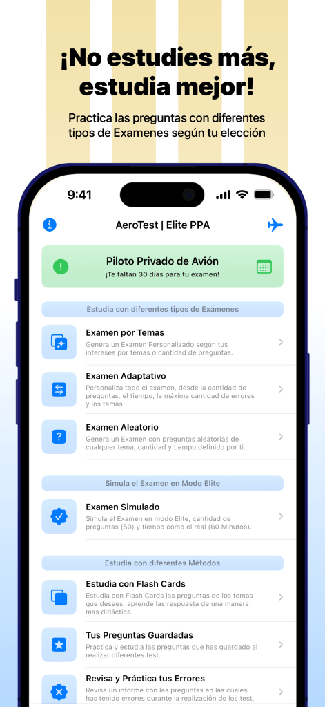AeroTest PPA es una aplicación diseñada para estudiantes de Piloto Privado de Avión que desean prepararse de manera eficiente para el examen teórico oficial.