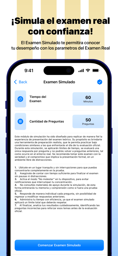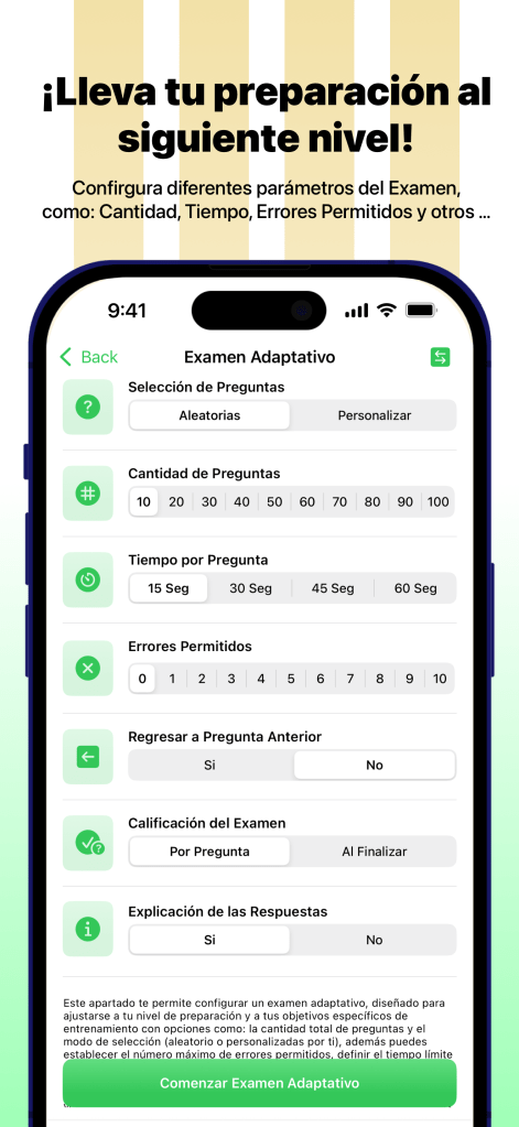 Ofrece múltiples modos de evaluación, incluyendo exámenes por tema, simulaciones realistas y tests adaptativos.